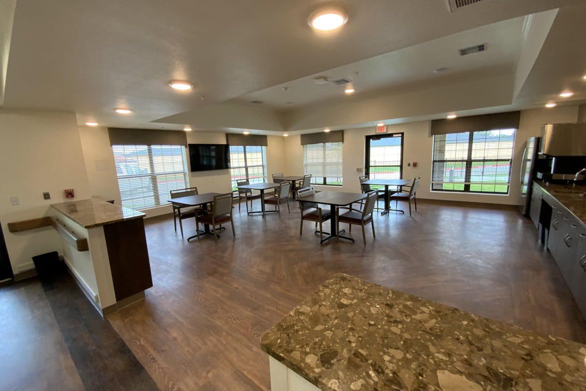 This design features a centralized, isolated staff service area with discreet access to back of house service areas. Nurse desks are positioned at each wing for efficient resident care. We developed a distinctive dining concept featuring separated booth areas, mimicking the atmosphere of a real restaurant. This design choice encourages social interaction and creates a more home-like environment for residents. Our team worked closely with local officials to integrate required Architectural Standards, resulting in a unique exterior that seamlessly blends functionality with aesthetics. The standing seam Porte Cochere roof complements the shingled main building, while the offset gable roof design adds visual interest.