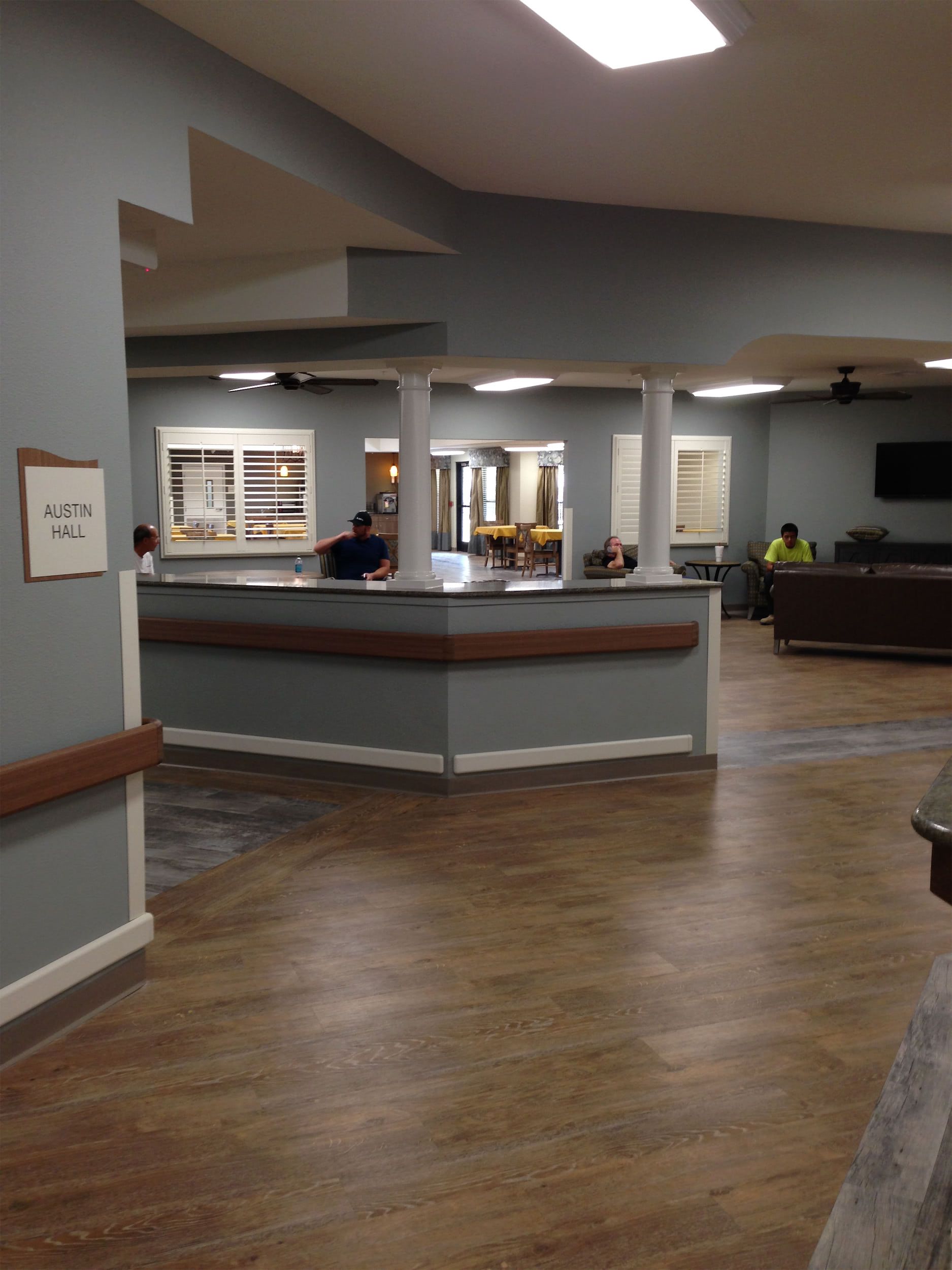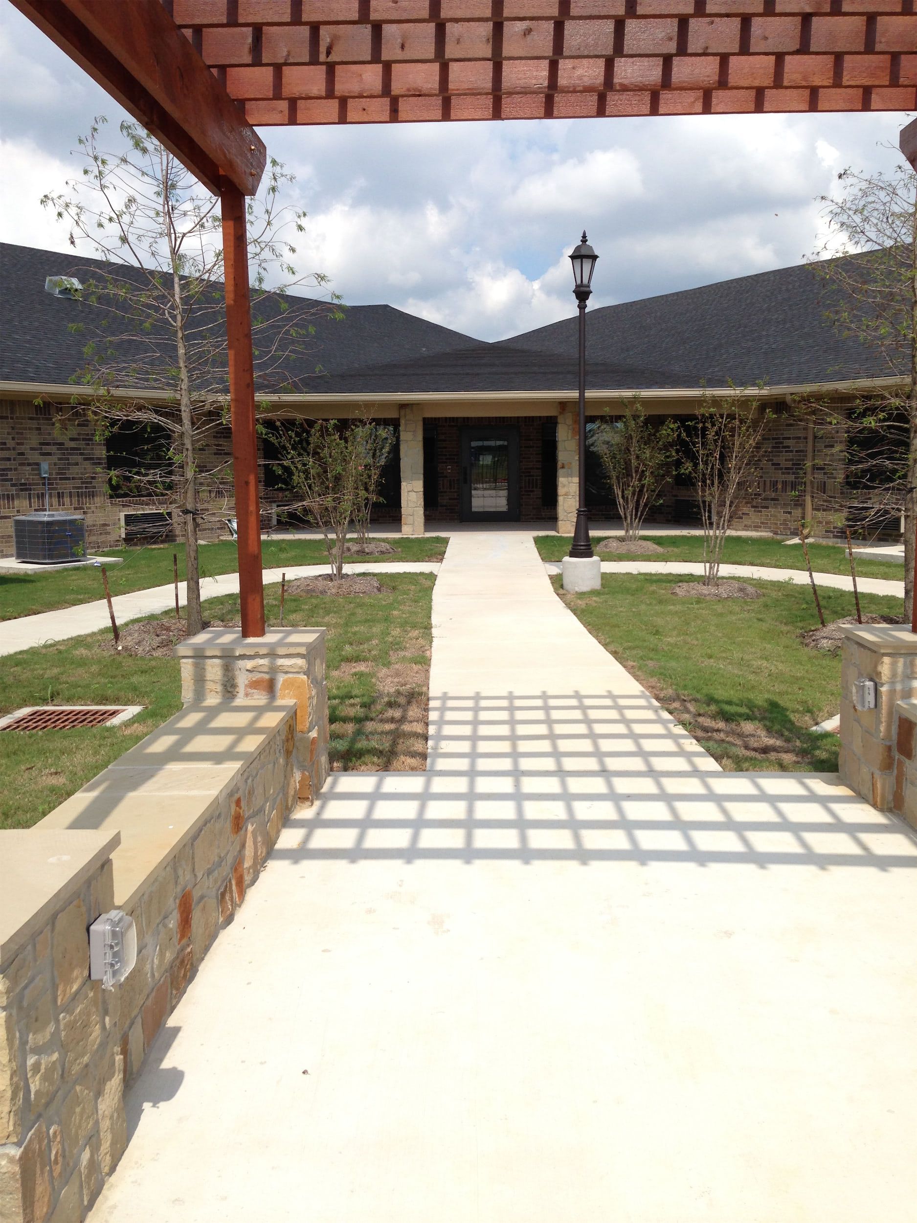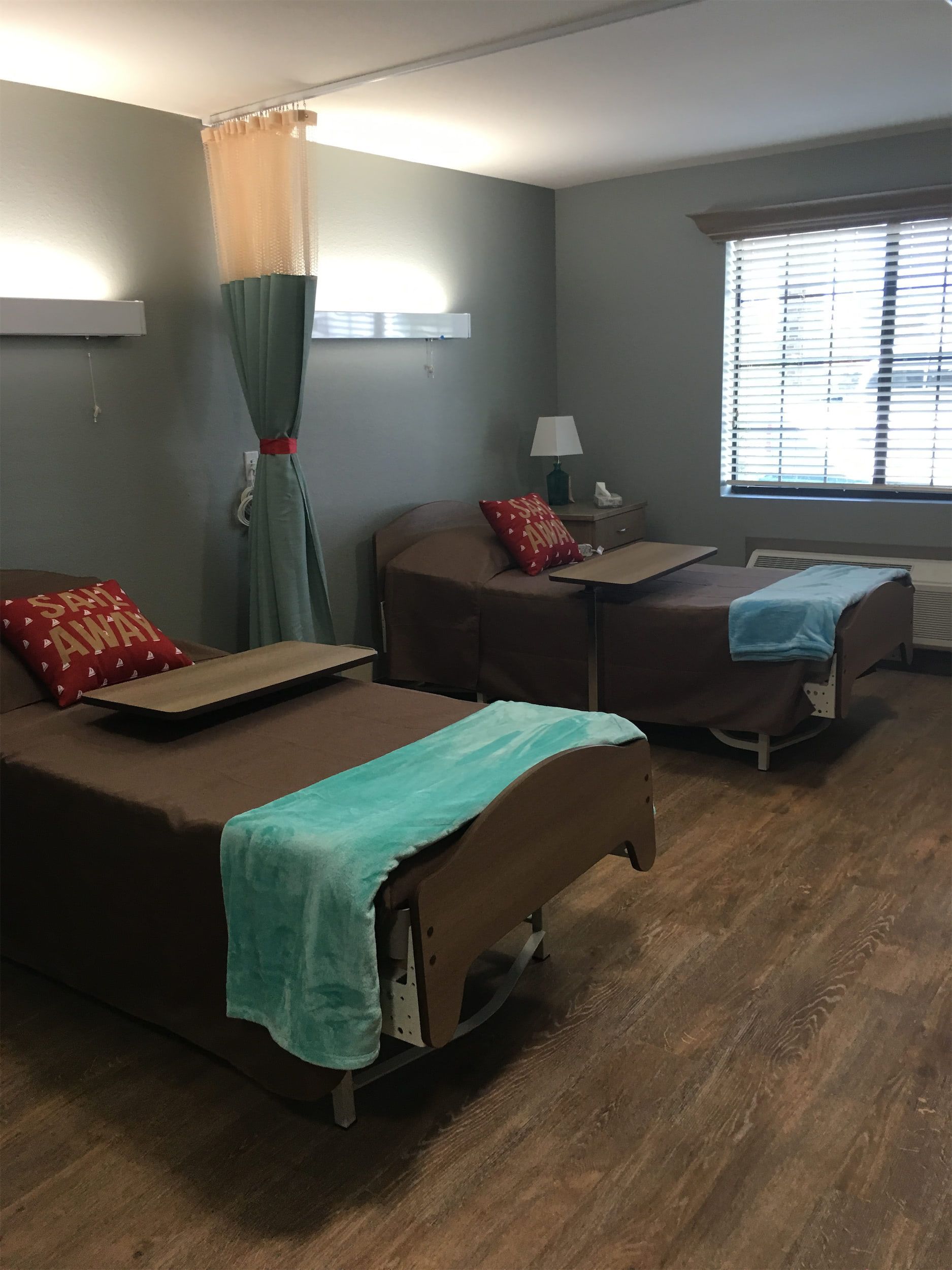 We developed this design to balance operational efficiency with resident comfort. The skewed K-Plan creates an inviting open plan lobby area, as well as extra room for courtyards between wings, providing spacious living areas and a large courtyard with a walking path, benches, and a pergola. We positioned the central nurse station for line of sight visual control of the entire building, including through the Dayroom into the wider courtyard, enhancing staff efficiency and resident safety. To break up typical long hallways, we widened corridors to allow for furniture placement. Multiple relaxation options for residents include Dayrooms, an Activity area, a library, and a covered Patio overlooking the courtyard. The Physical Therapy area serves both residents and outpatients, offering Physical, Speech, and Occupational Therapy services.